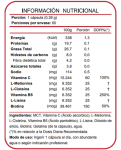 Este producto es un suplemento alimenticio, solo se debe consumir con fines de suplementar la dieta, no reemplaza una alimentación balanceada. No exponer a temperaturas sobre los 20ºC. Su consumo no es recomendado por menores de 8 años, embarazadas, nodrizas, salvo indicación profesional competente.
