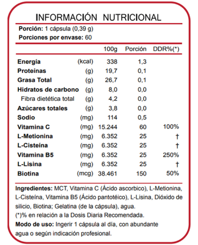 Este producto es un suplemento alimenticio, solo se debe consumir con fines de suplementar la dieta, no reemplaza una alimentación balanceada. No exponer a temperaturas sobre los 20ºC. Su consumo no es recomendado por menores de 8 años, embarazadas, nodrizas, salvo indicación profesional competente.