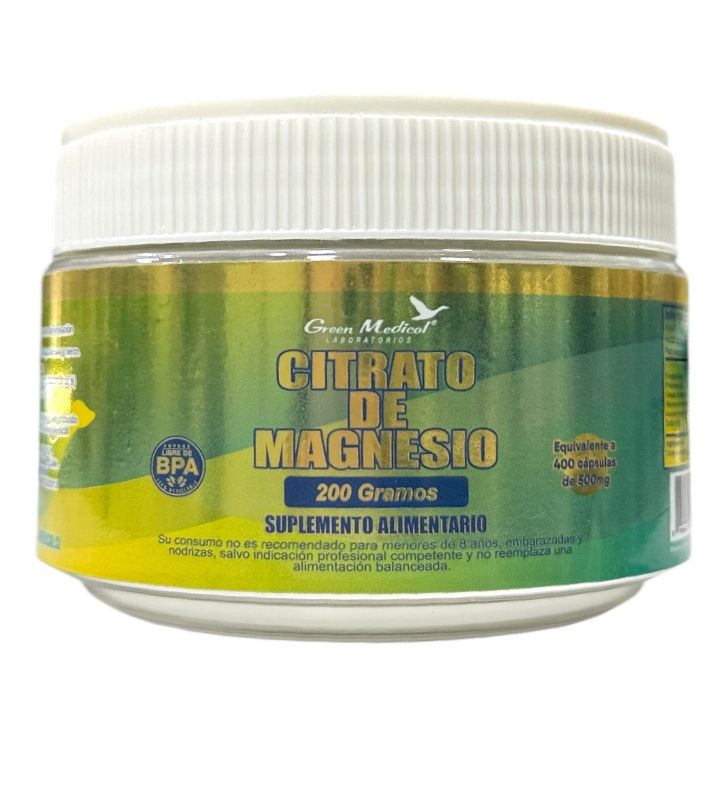 El Citrato de Magnesio en polvo de Green Medical (200g) es un suplemento de alta biodisponibilidad que apoya la salud ósea, muscular y nerviosa, ayudando a prevenir calambres, mejorar el sueño y reducir el estreñimiento. Se disuelve en agua, es apto para veganos y libre de gluten.