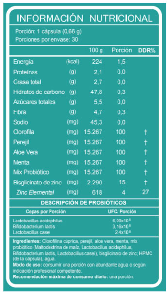 Clorofilina cúprica, perejil, aloe vera, menta, mix probiótico (Maltodextrina de maíz, Lactobacillus acidophilus, Bifidobacterium lactis, Lactobacillus casei), bisglicinato de zinc; HPMC (de la cápsula), agua.