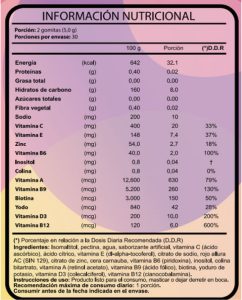 Isomaltitol, pectina, agua, saborizante artificial, vitamina C (ácido ascórbico), ácido cítrico, vitamina E (dl-alpha-tocoferol), citrato de sodio, rojo allura AC (SIN 129), citrato de zinc, cera carnauba, vitamina B6 (piridoxina), inositol, colina bitartrato, vitamina A (retinol acetato), vitamina B9 (ácido fólico), biotina, yoduro de potasio, vitamina D3 (colecalciferol), vitamina B12 (cianocobalamina).