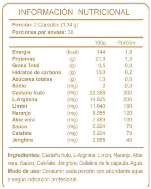 Castaño fruto, L-arginina, Limón, Naranjo, Aloe vera, Sauco, Calafate, Jengibre, Gelatina (de la cápsula), Agua.
