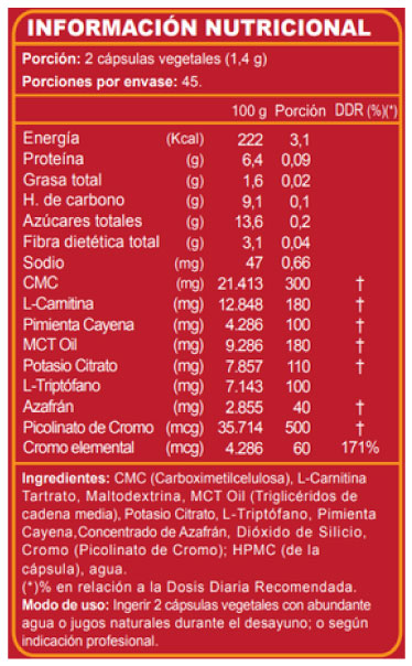 decadenamedia), Potasio Citrato,L-Triptófano, Pimienta Cayena, Concentrado de Azafrán, Dióxido de Silicio, Cromo(Picolinato de Cromo); HPMC (de la cápsula), Agua.