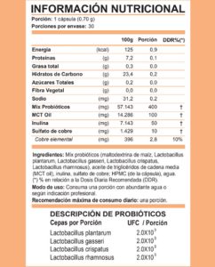 Mix probióticos 14 cepas, (maltodextrina de maíz, Lactobacillus plantarum, Lactobacillus gasseri, Lactobacillus crispatus, Lactobacillus rhamnosus), aceite de triglicéridos de cadena media (MCT oil), inulina, sulfato de cobre, HPMC (de la cápsula), agua.