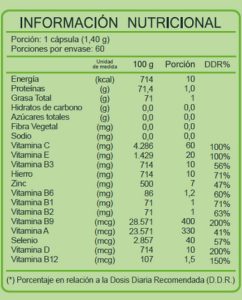 Este producto es un suplemento alimenticio, solo se debe consumir con fines de suplementar la dieta, no reemplaza una alimentación balanceada. No exponer a temperaturas sobre los 20ºC. Su consumo no es recomendado pormenores de 8 años, embarazadas, nodrizas, salvo indicación profesional competente. Este producto no pretende curar o diagnosticar ninguna enfermedad o patología ni sus síntomas. No es medicamento ni producto farmacéutico. Elaborado en Chile en líneas que también procesan gluten, nueces, maní, almendras, lecitina de soya y pescados. No apto para veganos.