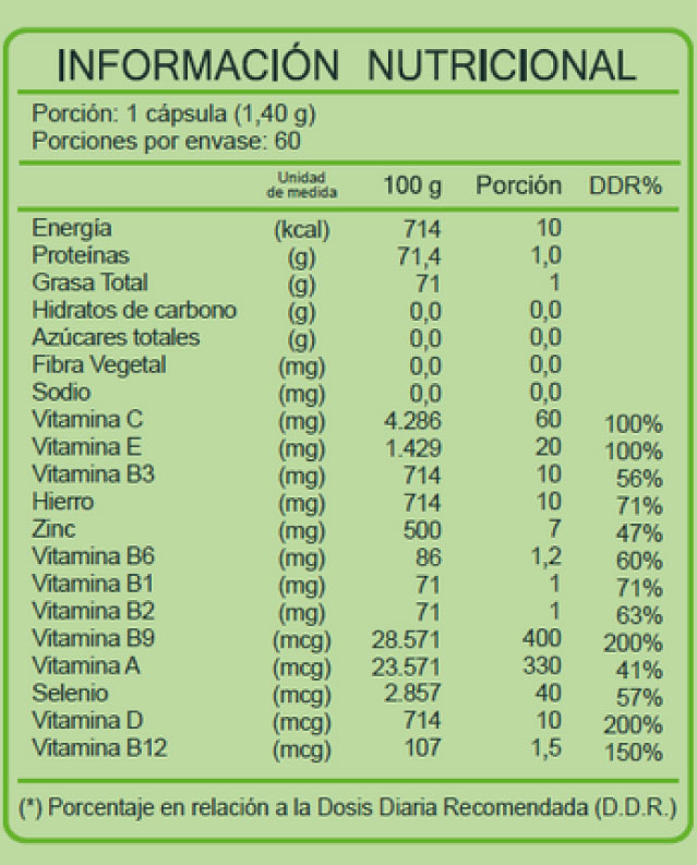 Este producto es un suplemento alimenticio, solo se debe consumir con fines de suplementar la dieta, no reemplaza una alimentación balanceada. No exponer a temperaturas sobre los 20ºC. Su consumo no es recomendado pormenores de 8 años, embarazadas, nodrizas, salvo indicación profesional competente. Este producto no pretende curar o diagnosticar ninguna enfermedad o patología ni sus síntomas. No es medicamento ni producto farmacéutico. Elaborado en Chile en líneas que también procesan gluten, nueces, maní, almendras, lecitina de soya y pescados. No apto para veganos.