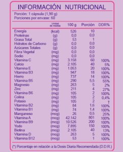 Vitamina C, Calcio, Vitamina E, Vitamina B3,Hierro, Vitamina B5, Magnesio, Zinc, Vitamina B6, Colina, Potasio, Vitamina B2,Vitamina B1, Manganeso, Vitamina A, VitaminaB9, Yodo, Biotina, Vitamina D, Vitamina B12,Gelatina (de la cápsula).